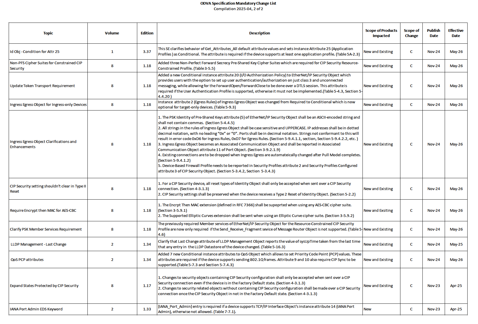 For the complete ODVA Specification Mandatory Change List, including past changes, see PUB317 R21.
